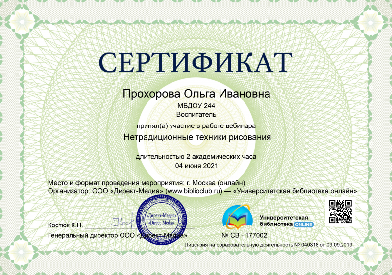 Сертификат об участии в вебинаре "Нетрадиционные техники рисования"